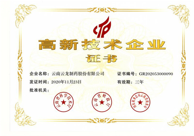 近日,云南云龍制藥股份有限公司(以下簡稱“云龍制藥”)被認(rèn)定為“國家級高新技術(shù)企業(yè)”,這是繼2011年首次認(rèn)定,2014年復(fù)審?fù)ㄟ^,2017年第二次認(rèn)定之后,云龍制藥第三次獲此認(rèn)定。